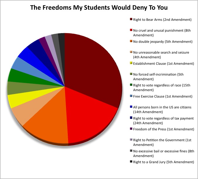 So, here, below, are this year’s entries* for the civil liberties that my students would remove from the Constitution if they absolutely had to. The legend begins with the top-right piece of the pie and then proceeds clockwise.