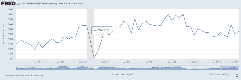 …it looks like housing starts recovered from the lockdowns by mid-to-late-2020, went up a bit until spring of 2022, and have dropped off a bit since then. So the slow-ish supply is likely contributing to higher prices, too.